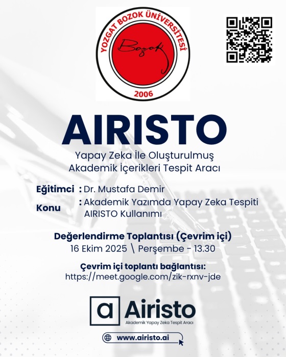 Üniversitemizin deneme erişiminde olan Airisto.AI için gerçekleşecek olan eğitime katılımlarınızı rica eder, iyi çalışmalar dileriz.